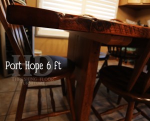 Details of table: 6 ft Plank style base – 3″ reclaimed joist material posts- 8″x8″ end cavity – reclaimed threshing floor hemlock – premium epoxy/matte polyurethane finish