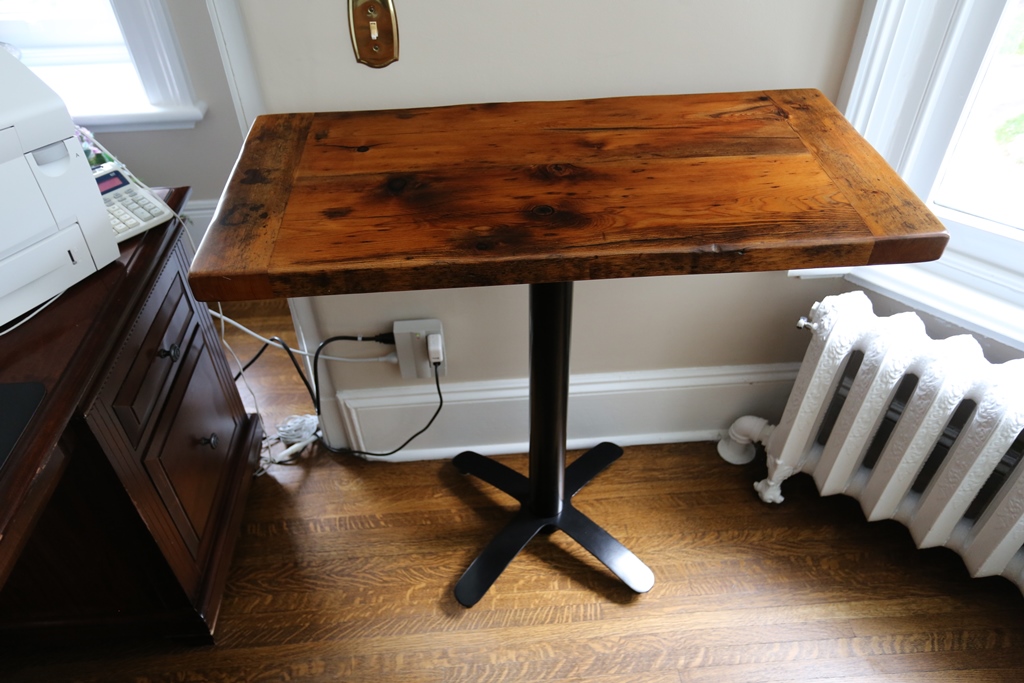 The 2 inch tops are made from reclaimed barn floor boards, also called threshing floor boards. The perpendicular bread edge boards on the ends ensure authentically distressed barn board edges on all sides. Any hand-hewn beams come from the structure of an old barn. Legs are made from original barn wind brace beams, which support the large, structural beams in a pioneer barn. All 1" thick material we use is from an old barn's interior grainery room, also called grainery boards.